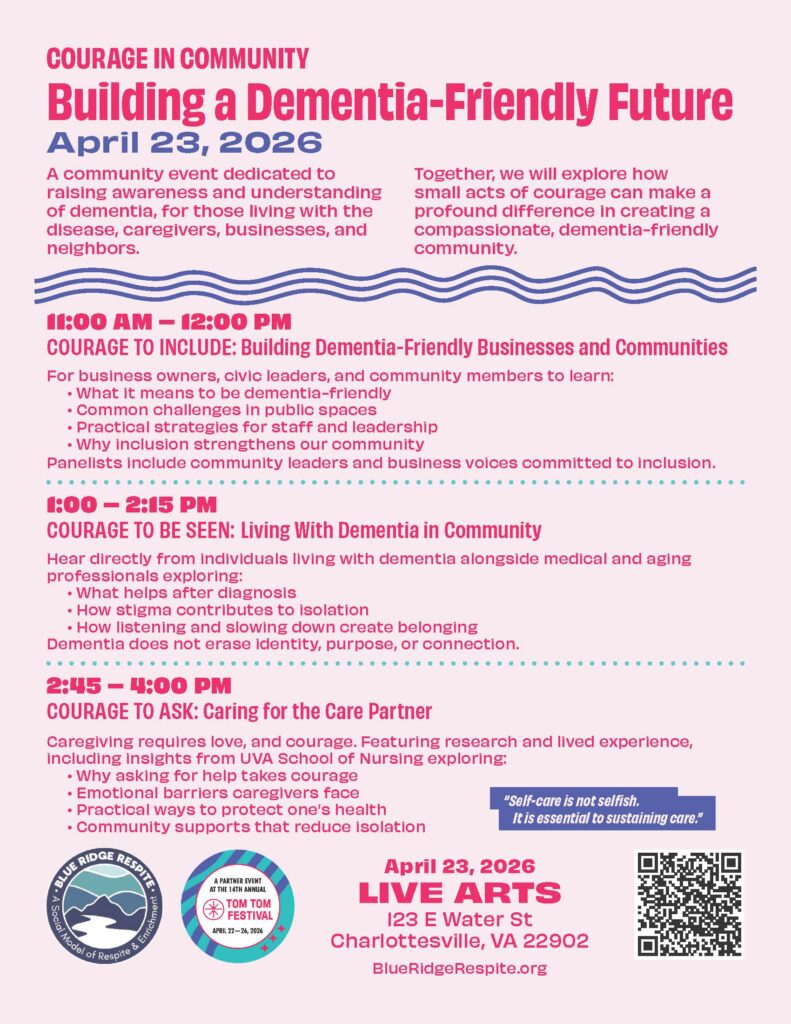 Blue Ridge Respite will host a community-centered event as part of the Tom Tom Festival. Titled “Courage in Community – Building a Dementia-Friendly Future,” this free, one-day gathering invites residents to come together, share experiences, and explore how to create a more inclusive and supportive environment for people living with dementia.
