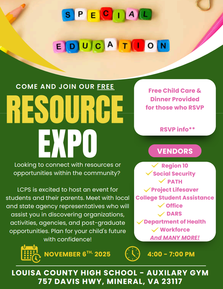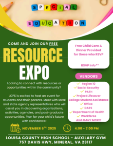 Louisa County Public Schools will host the 2025 Resource Expo on Thursday, November 6, 2025, from 4:00 to 7:00 p.m. at the Louisa County High School Annex Gym.
