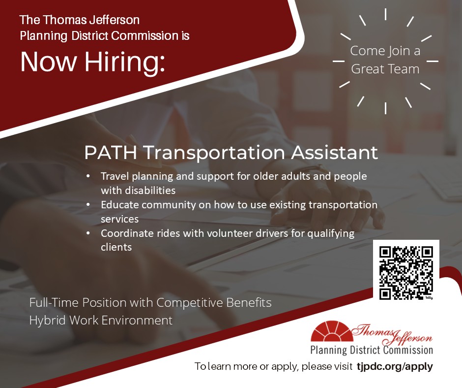 The Thomas Jefferson Planning District Commission (TJPDC) is looking for a passionate PATH Transportation Assistant to support older adults and people with disabilities in accessing the rides they need.